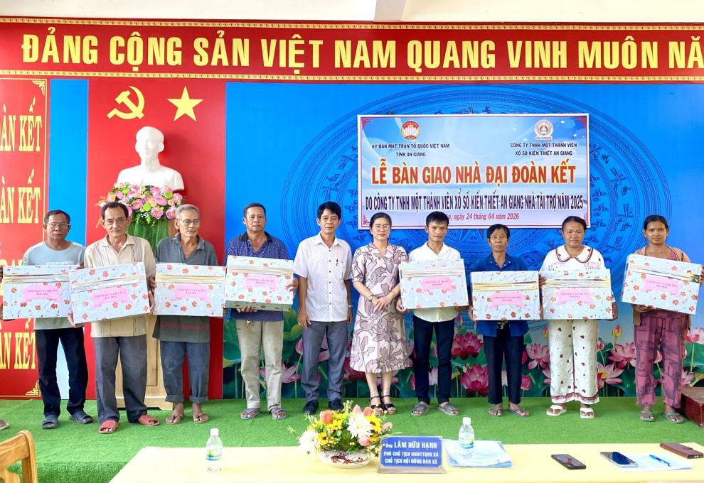 Sáng ngày 24 tháng 4 năm 2026, Ủy ban Mặt trận Tổ quốc Việt Nam xã Tri Tôn đã phối hợp với Công ty TNHH MTV Xổ số Kiến thiết An Giang tổ chức lễ bàn giao 10 căn nhà “Đại đoàn kết” cho các hộ nghèo và hộ có hoàn cảnh khó khăn trên địa bàn.