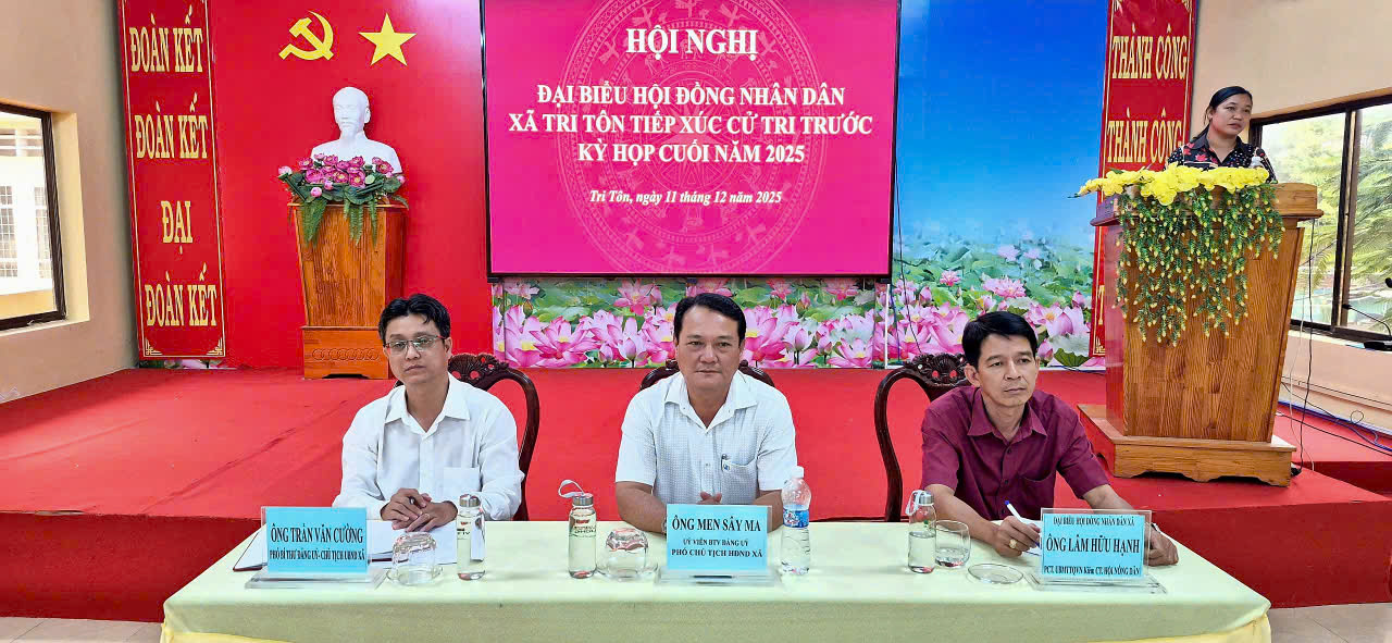 Chiều ngày 11/12/2025, tại Hội trường UBND xã Tri Tôn, Tổ đại biểu HĐND xã đơn vị số 3 đã có buổi tiếp xúc với trên 150 cử tri của 8 ấp gồm ấp 1, ấp 2, ấp 3, ấp 4, ấp 5, ấp 6, ấp An Lộc và ấp Cây Me. Tham dự buổi tiếp xúc có Ông Trần Văn Cường – Phó Bí thư Đảng ủy – Chủ tịch UBND xã Tri Tôn; Ông Men Sây Ma – Ủy viên Ban Thường vụ - Phó Chủ tịch HĐND xã Tri Tôn; Ông Lâm Hữu Hạnh – Phó Chủ tịch UBMTTQVN kiêm Chủ tịch Hội nông dân xã Tri Tôn.