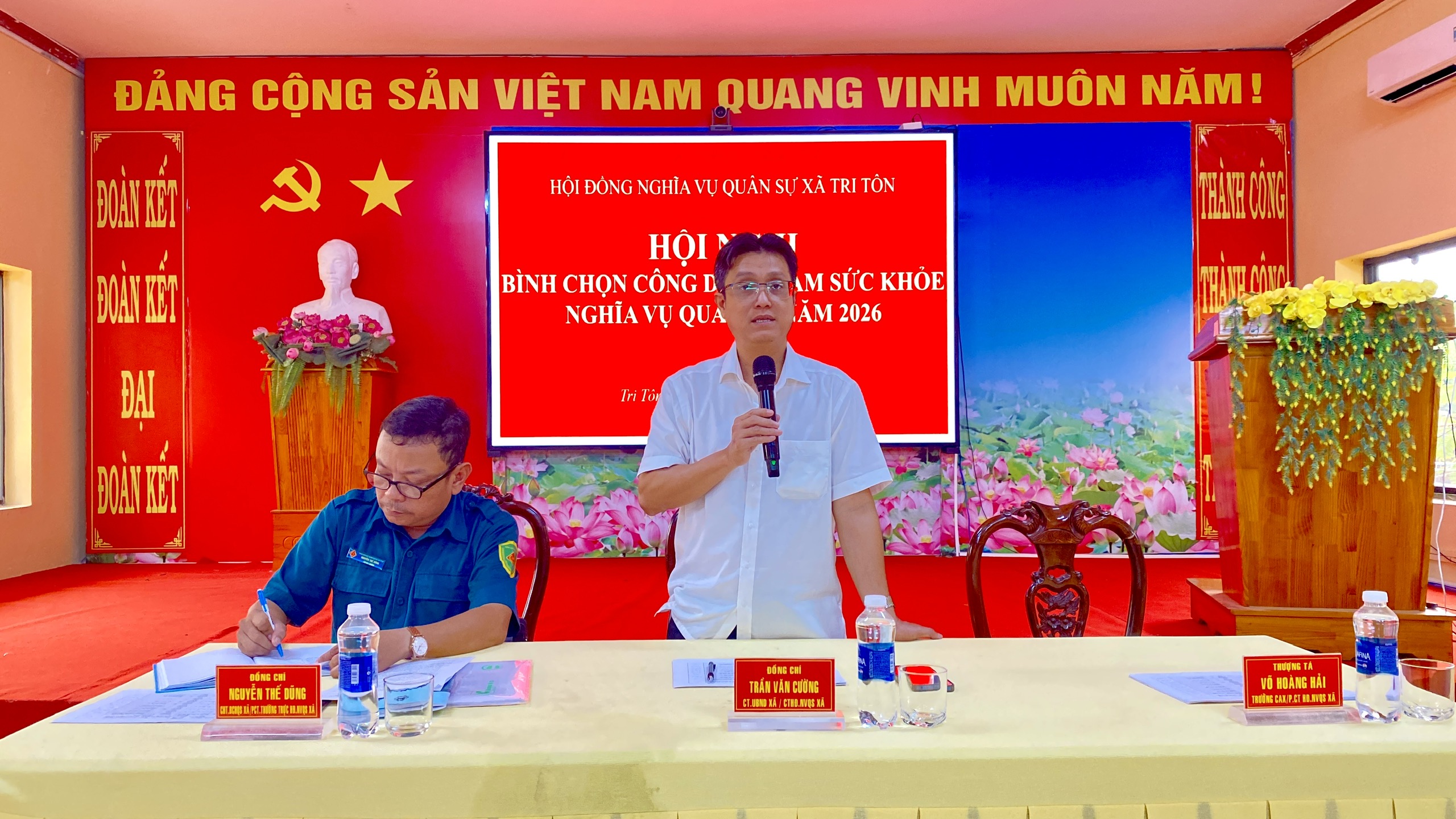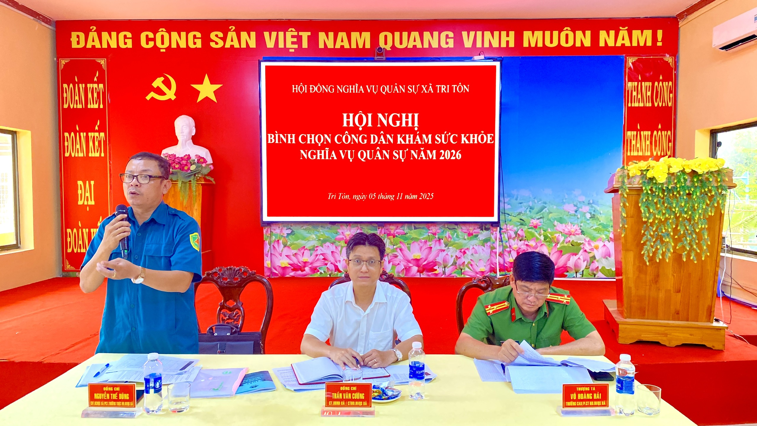 Trong hai ngày, từ ngày 5 đến ngày 6 tháng 11 năm 2025, Hội đồng Nghĩa vụ quân sự xã Tri Tôn tổ chức hội nghị bình chọn công dân khám sức khỏe nghĩa vụ quân sự năm 2026. Đồng chí Trần Văn Cường – Phó Bí thư Đảng ủy, Chủ tịch UBND xã, Chủ tịch Hội đồng Nghĩa vụ quân sự xã Tri Tôn chủ trì hội nghị.