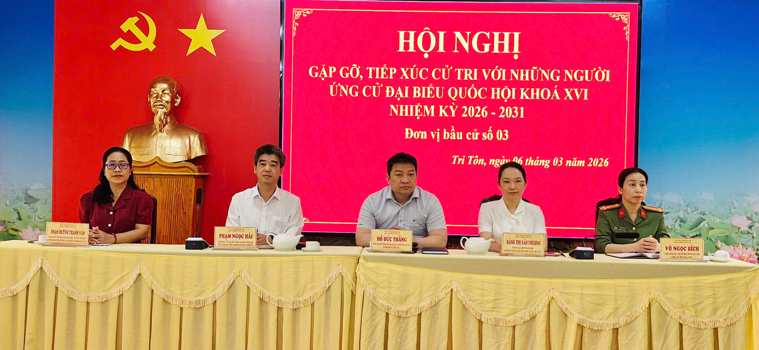 Sáng ngày 06/03/2026, tại hội trường UBND xã Tri Tôn, Ban Thường trực Ủy ban MTTQ Việt Nam tỉnh An Giang tổ chức hội nghị gặp gỡ, tiếp xúc giữa cử tri với những người ứng cử đại biểu Quốc hội khóa XVI đơn vị bầu cử số 3. Tham dự có Bà Nguyễn Thị Quyến – Phó Chủ tịch Hội LHPN tỉnh – Trưởng Ban công tác phụ nữ cơ quan UBMTTQVN tỉnh An Giang; cùng các đồng chí lãnh đạo Đảng uỷ - HĐND – UBND – UBMTTQVN xã và hơn 140 cử tri của 2 xã Tri Tôn và xã Cô Tô tham dự.