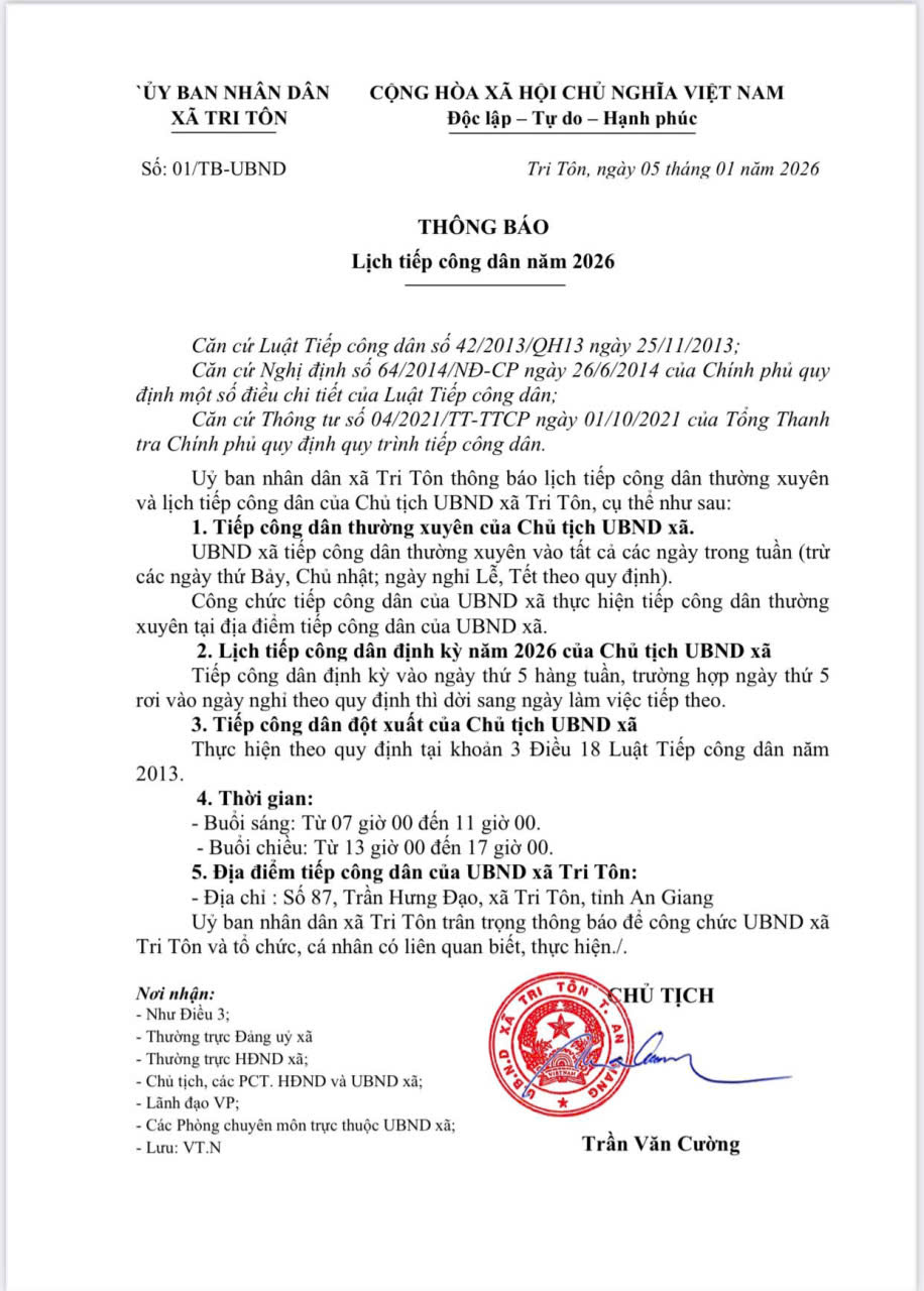 Thông báo: Lịch tiếp công dân năm 2026