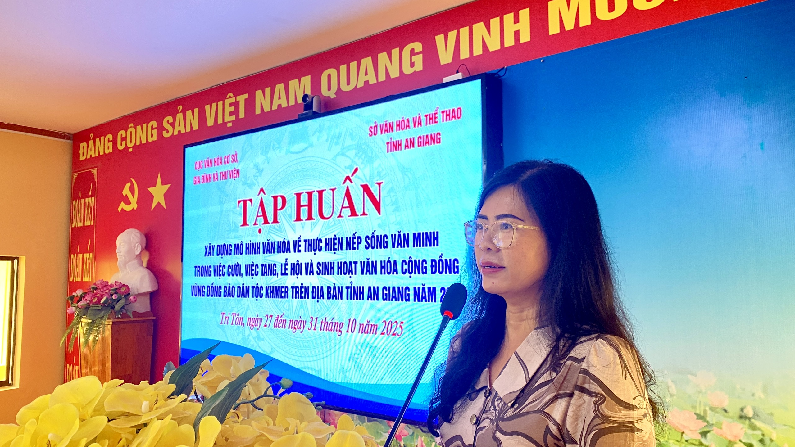 Từ ngày 27 đến 31/10/2025, Cục Văn hóa cơ sở, Gia đình và Thư viện phối hợp với Sở Văn hóa và Thể thao tỉnh An Giang tổ chức lớp tập huấn “Xây dựng và nhân rộng các mô hình văn hóa thực hiện nếp sống văn minh trong việc cưới, việc tang, lễ hội và sinh hoạt văn hóa cộng đồng vùng đồng bào dân tộc Khmer” tại xã Tri Tôn.