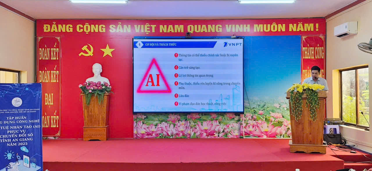 Sáng ngày 16 tháng 10 năm 2025, Sở Khoa học và Công nghệ tỉnh An Giang phối hợp với Ủy ban nhân dân xã Tri Tôn tổ chức lớp tập huấn ứng dụng công nghệ Trí tuệ nhân tạo (AI) phục vụ chuyển đổi số cho lãnh đạo các cơ quan, đơn vị và chính quyền các xã, phường, gồm: Tri Tôn, An Cư, Núi Cấm, Tịnh Biên, Chi Lăng, Ba Chúc, Ô Lâm, Cô Tô và Vĩnh Gia.