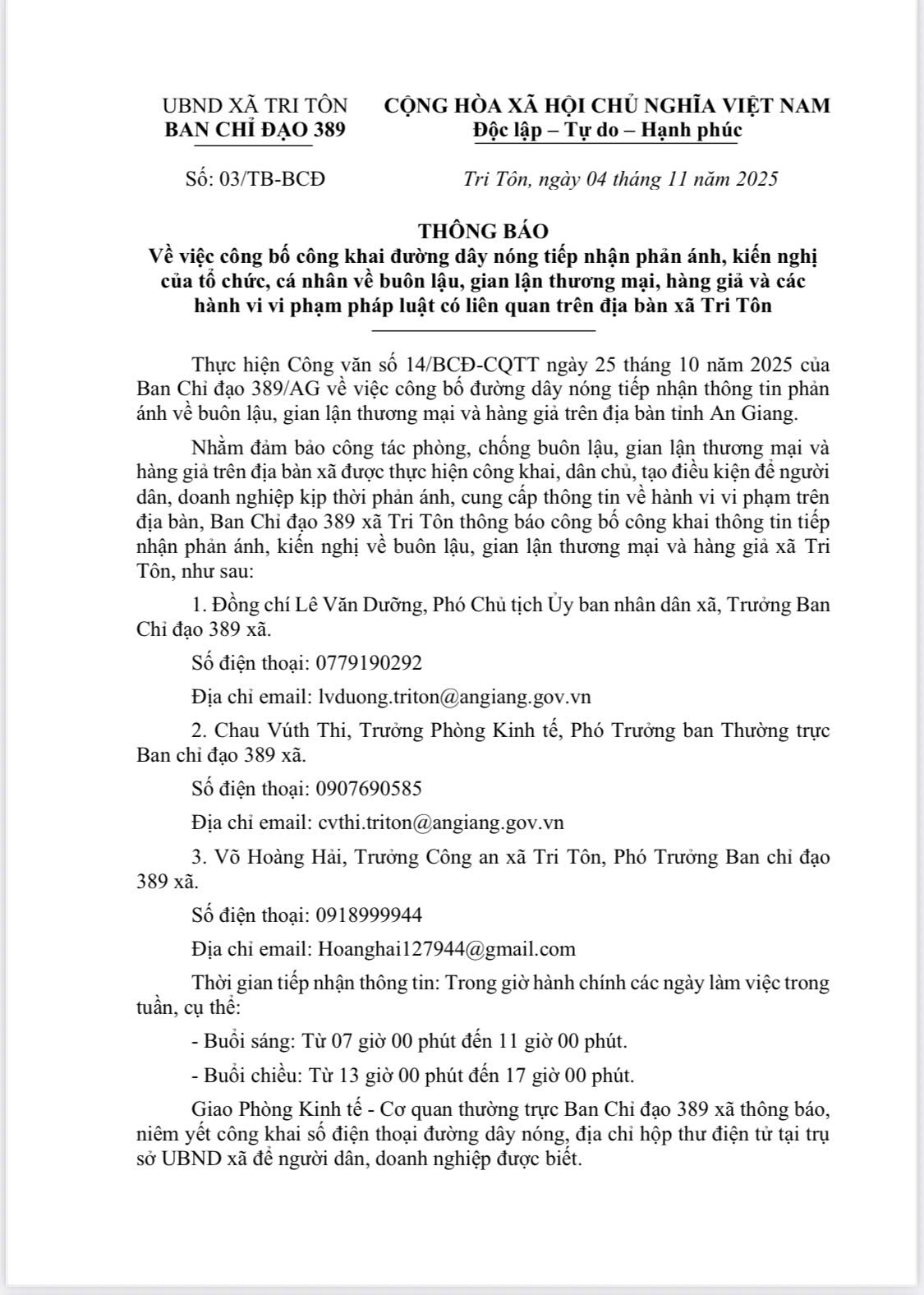 THÔNG BÁO : Về việc công bố công khai đường dây nóng tiếp nhận phản ánh, kiến nghị của tổ chức, cá nhân về buôn lậu, gian lận thương mại, hàng giả và các hành vi vi phạm pháp luật có liên quan trên địa bàn xã Tri Tôn 04/11/2025 Read more