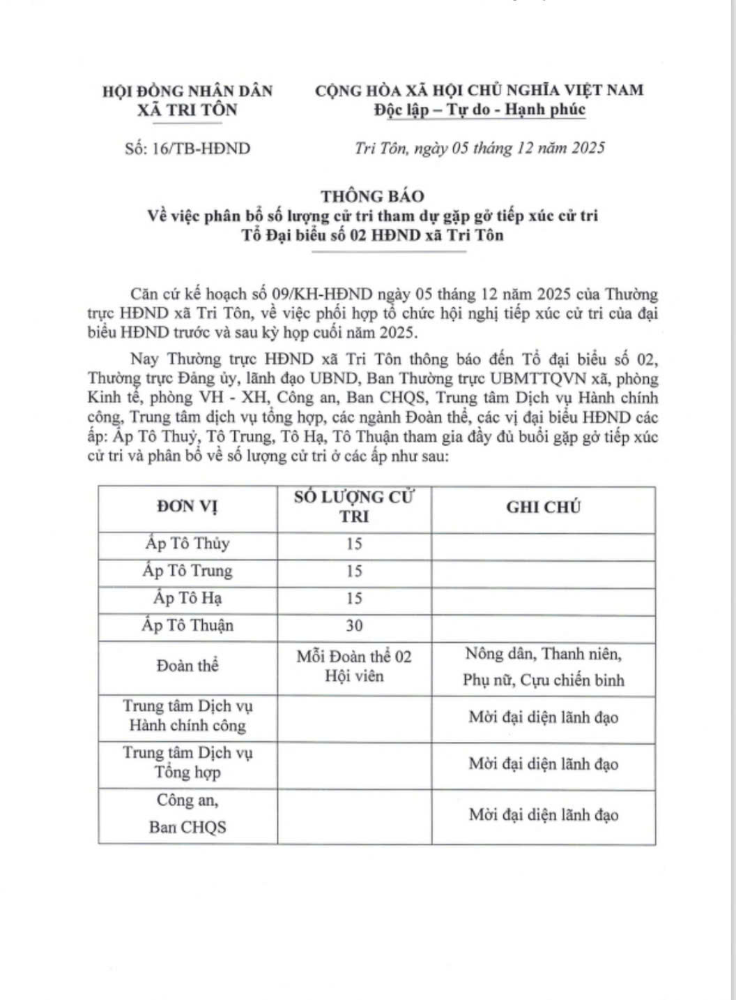 Thông báo Thông báo: Về việc phân bổ số lượng cử tri tham dự gặp gỡ tiếp xúc cử tri Tổ Đại biểu số 02 HĐND xã Tri Tôn 06/12/2025 - aA + Submitted by Biên tập viên on 6 December 2025 Tài liệu đính kèm: 16 - TB phan bo so luong tiep xuc cu tri TĐB02.signed.pdf (677.82 KB) Bài viết liên quan Thông báo: Về việc phân bổ số lượng cử tri tham dự gặp gỡ tiếp xúc cử tri Tổ Đại biểu số 03 HĐND xã Tri Tôn 14/01/2026 Thông báo: Về việc phân bổ số lượng cử tri tham dự gặp gỡ tiếp xúc cử tri Tổ Đại biểu số 02 HĐND xã Tri Tôn 14/01/2026 Thông báo: Về việc phân bổ số lượng cử tri tham dự gặp gỡ tiếp xúc cử tri Tổ Đại biểu số 01 HĐND xã Tri Tôn 14/01/2026 Thông báo: Lịch tiếp công dân năm 2026 08/01/2026 Báo cáo Công tác phòng, chống tham nhũng năm 2025 của UBND xã Tri tôn 06/01/2026 Nghị quyết về kế hoạch tổ chức các kỳ họp Hội đồng nhân dân xã năm 2026 05/01/2026