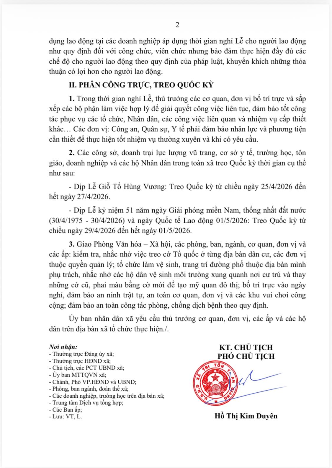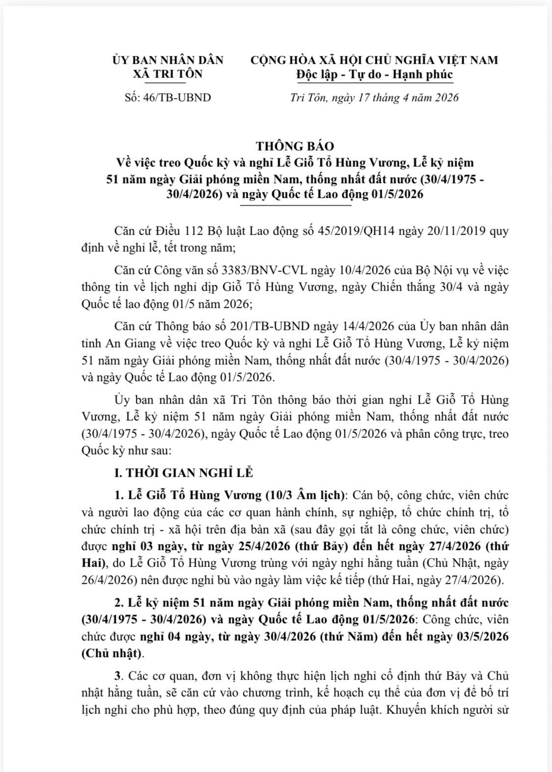 Thông báo về việc treo Quốc kỳ và nghỉ Lễ Giỗ Tổ Hùng Vương, Lễ kỷ niệm 51 năm ngày Giải phóng miền Nam, thống nhất đất nước (30/4/1975-30/4/2026) và ngày Quốc tế Lao động 01/5/2026