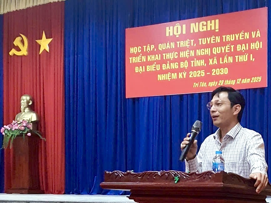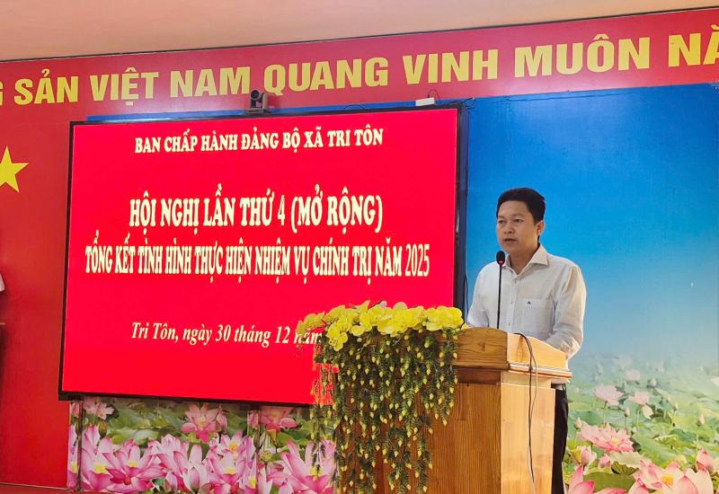 Sáng ngày 30/12/2025, Ban Chấp hành Đảng bộ xã Tri Tôn tổ chức Hội nghị lần thứ IV (mở rộng) tổng kết tình hình thực hiện nhiệm vụ chính trị năm 2025, đề ra phương hướng nhiệm vụ năm 2026. Tham dự có Ủy viên Ban Thường vụ, Chủ nhiệm Ủy ban Kiểm tra Tỉnh ủy An Giang Huỳnh Quốc Thái; Tỉnh Uỷ viên, Bí thư Đảng ủy, Chủ tịch HĐND xã Tri Tôn Lâm Thành Sĩ; Phó bí thư Thường trực Đảng ủy xã Lộ Vinh Huy; Phó Bí thư Đảng ủy, Chủ tịch UBND xã Trần Văn Cường.