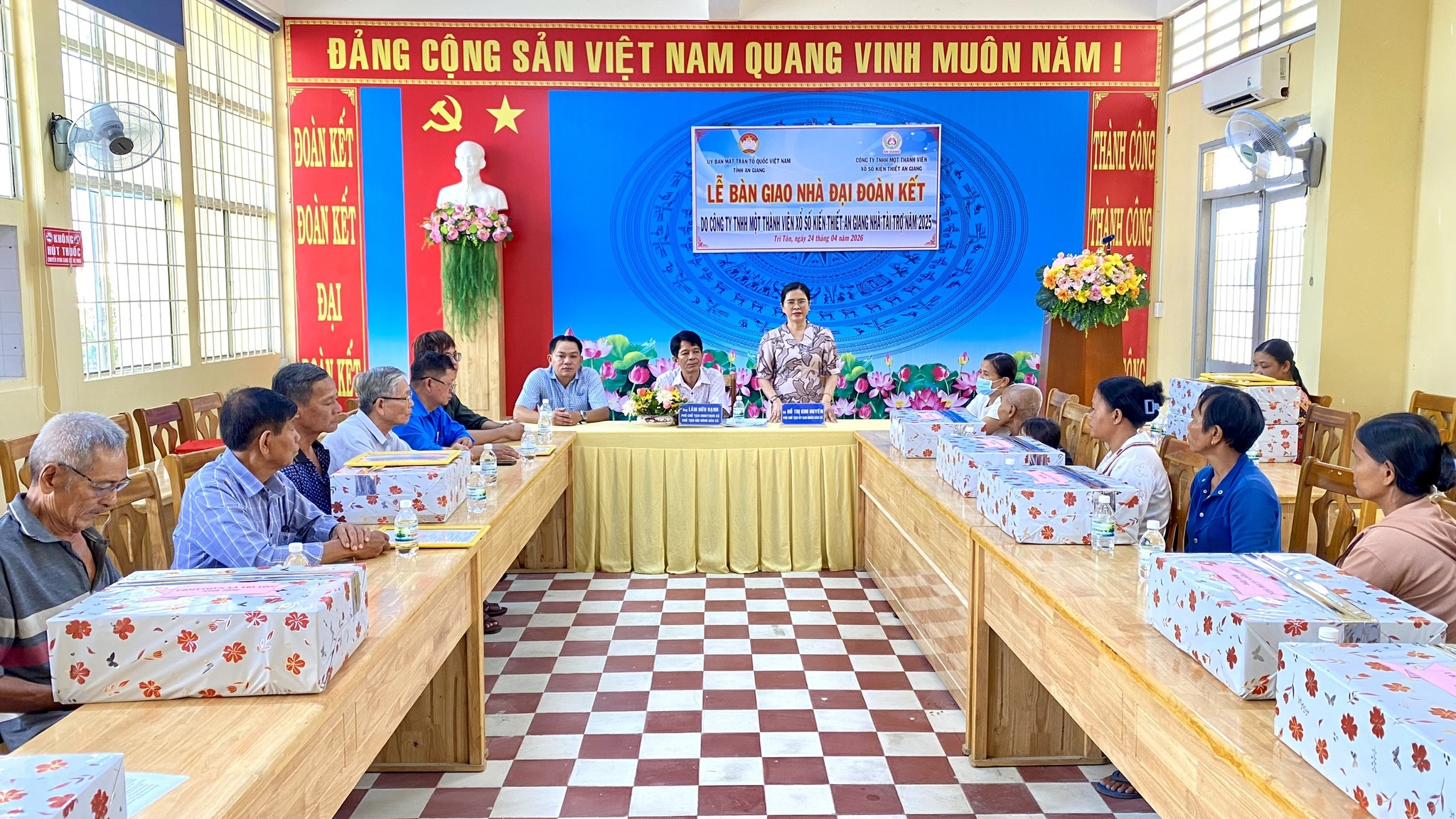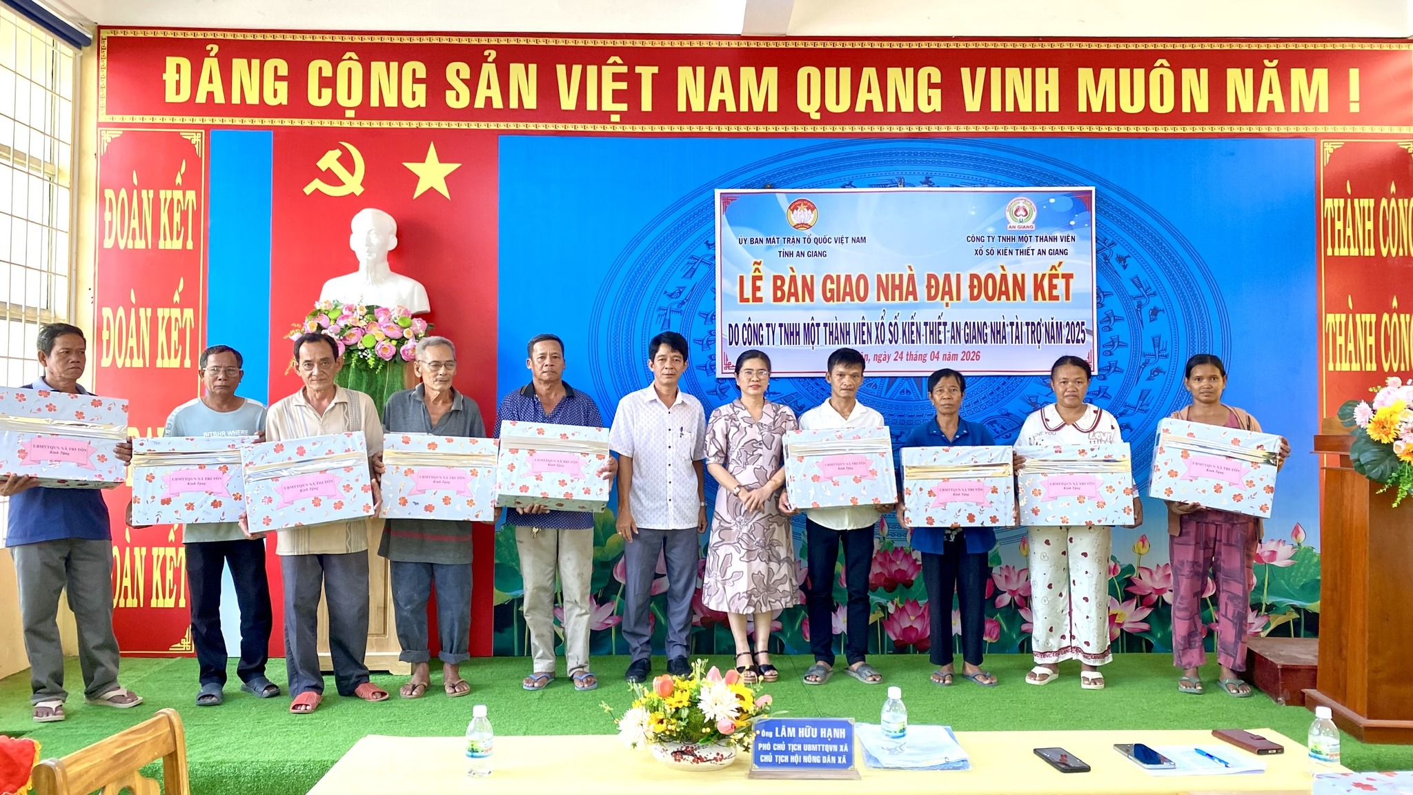 Sáng ngày 24 tháng 4 năm 2026, Ủy ban Mặt trận Tổ quốc Việt Nam xã Tri Tôn đã phối hợp với Công ty TNHH MTV Xổ số Kiến thiết An Giang tổ chức lễ bàn giao 10 căn nhà “Đại đoàn kết” cho các hộ nghèo và hộ có hoàn cảnh khó khăn trên địa bàn.