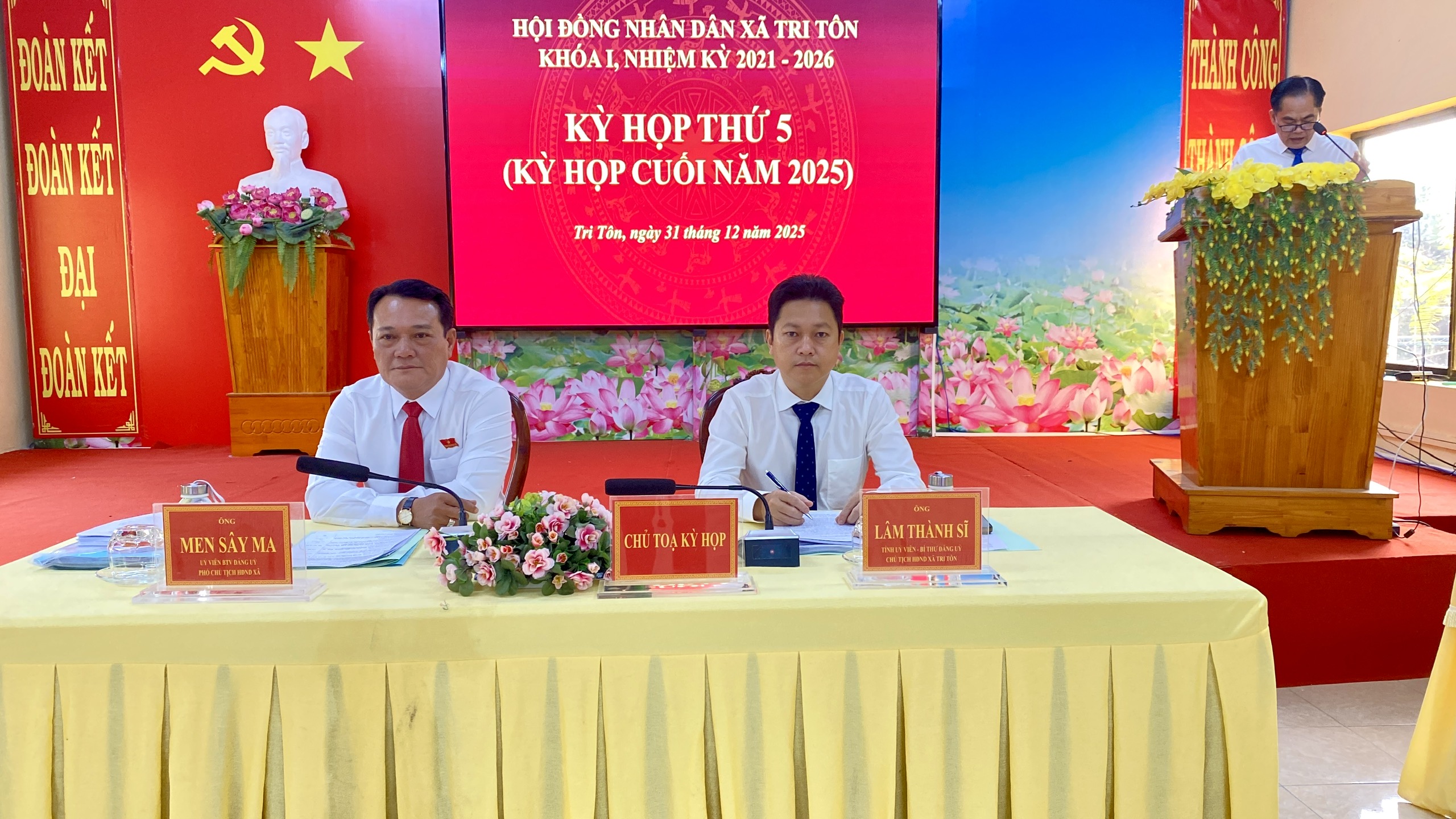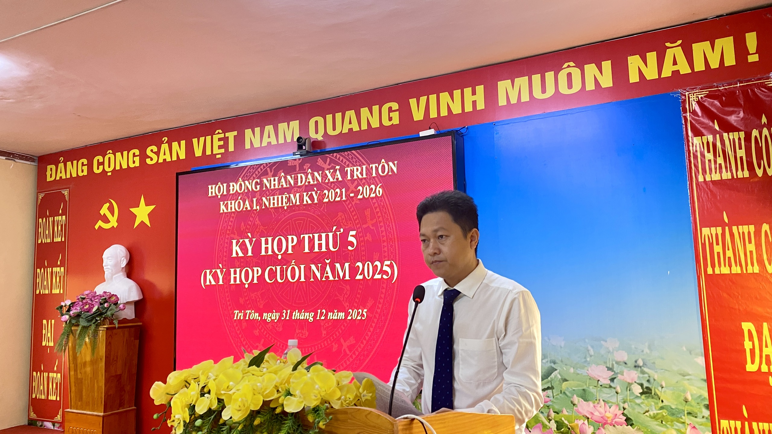 Sáng ngày 31 tháng 12 năm 2025, Hội đồng Nhân dân xã Tri Tôn tổ chức kỳ họp thứ 5 – kỳ họp cuối năm, HĐND xã khóa I, nhiệm kỳ 2021 – 2026, nhằm đánh giá kết quả thực hiện nhiệm vụ phát triển kinh tế – xã hội năm 2025 và quyết định các nội dung quan trọng cho năm 2026. Tham dự kỳ họp có ông Cao Quang Liêm, Tổ Phó Tổ đại biểu Hội đồng Nhân dân tỉnh An Giang, đơn vị số 7; đồng chí Lâm Thành Sĩ, Tỉnh ủy viên, Bí thư Đảng ủy, Chủ tịch Hội đồng Nhân dân xã Tri Tôn, cùng các đại biểu HĐND xã.