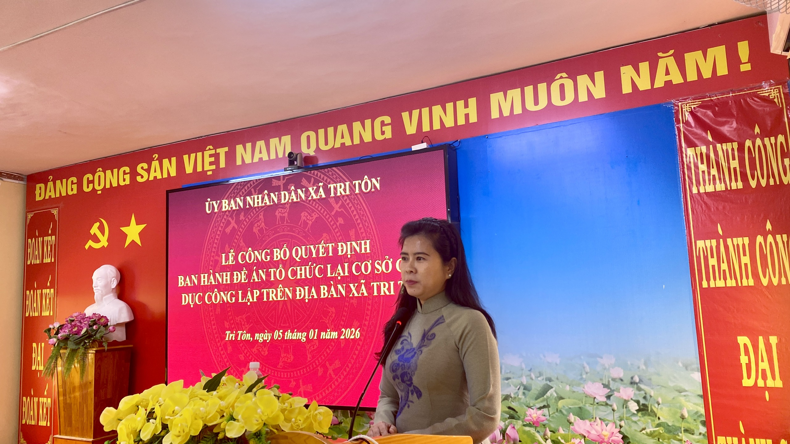 Sáng ngày 5/1/2026, UBND xã Tri Tôn tổ chức Lễ công bố Quyết định ban hành Đề án tổ chức lại các cơ sở giáo dục công lập trên địa bàn xã. Đến dự có bà Hồ Thị Kim Duyên – Ủy viên Ban Thường vụ Đảng ủy, Phó Chủ tịch UBND xã Tri Tôn, cùng đại diện các ban, ngành và đơn vị trường học.