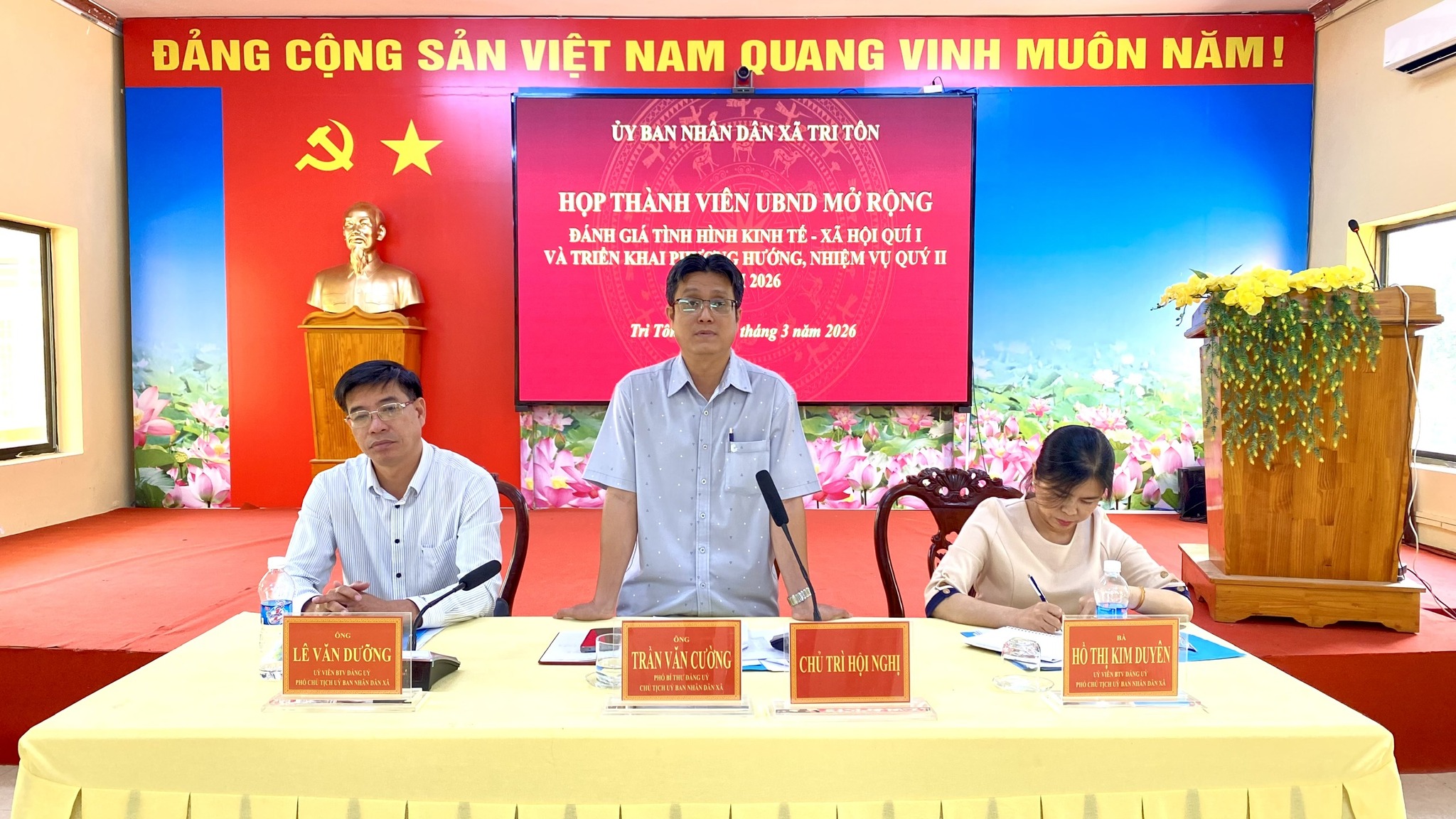 Sáng ngày 30/3/2026, UBND xã Tri Tôn tổ chức cuộc họp thành viên UBND mở rộng nhằm đánh giá tình hình phát triển kinh tế - xã hội quý I và đề ra phương hướng, nhiệm vụ quý II năm 2026. Đến dự có đồng chí Lộ Vinh Huy – Phó Bí thư Thường trực Đảng ủy xã; đồng chí Trần Văn Cường – Phó Bí thư Đảng ủy, Chủ tịch UBND xã Tri Tôn chủ trì hội nghị.