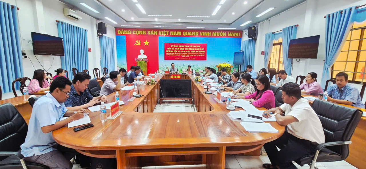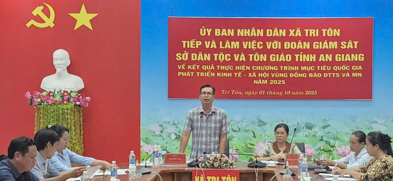 Chiều ngày 01/10/2025, Đoàn giám sát do Phó Giám đốc Sở Dân tộc và Tôn giáo tỉnh An Giang Danh Tha làm trưởng đoàn đã có buổi giám sát, đánh giá việc thực hiện chương trình mục tiêu quốc gia về phát triển kinh tế - xã hội vùng đồng bào dân tộc thiểu số và miền núi năm 2025 trên địa bàn các xã Tri Tôn, Ba Chúc, Cô Tô, Ô Lâm, Óc Eo, An Cư, Núi Cấm và Phường Chi Lăng. Tiếp đoàn có Phó Chủ tịch UBND xã Tri Tôn Hồ Thị Kim Duyên.