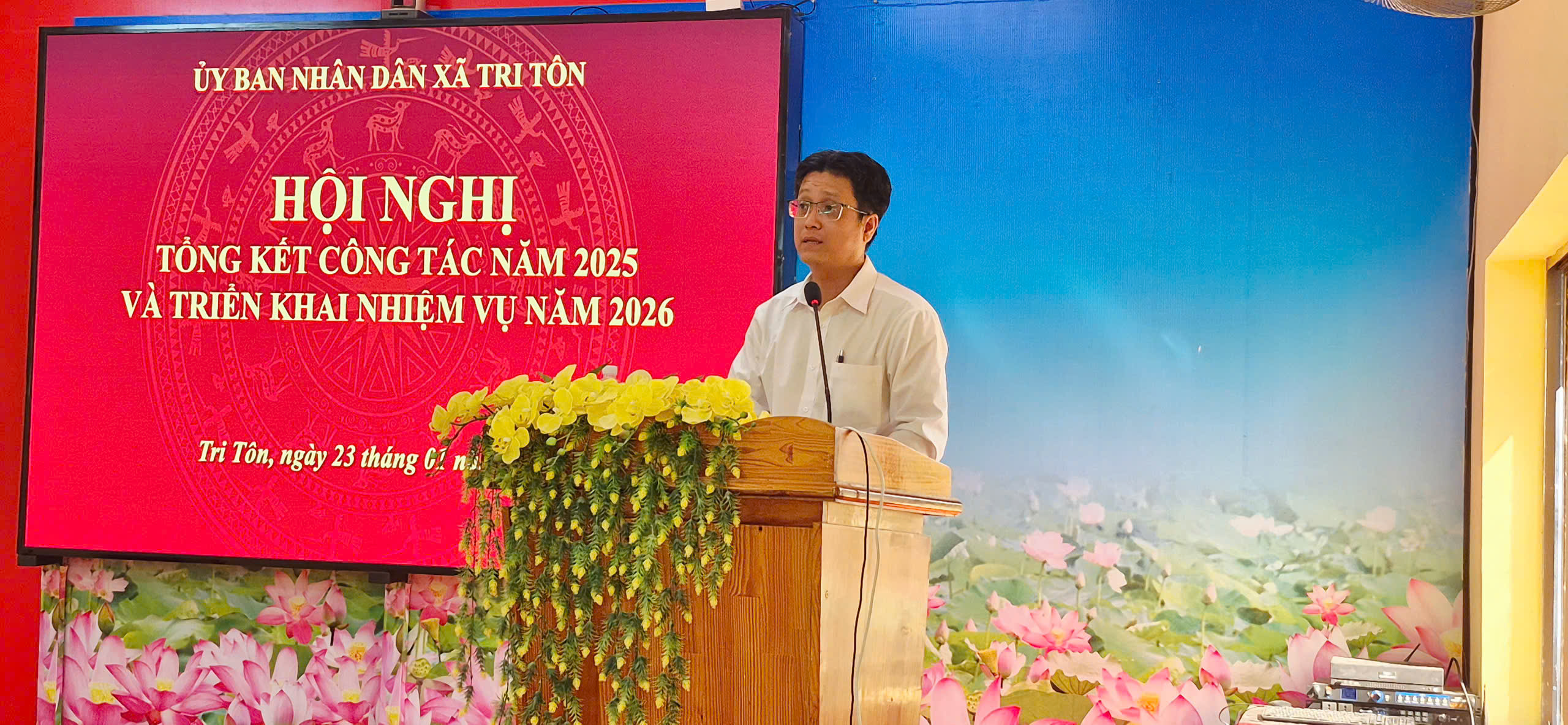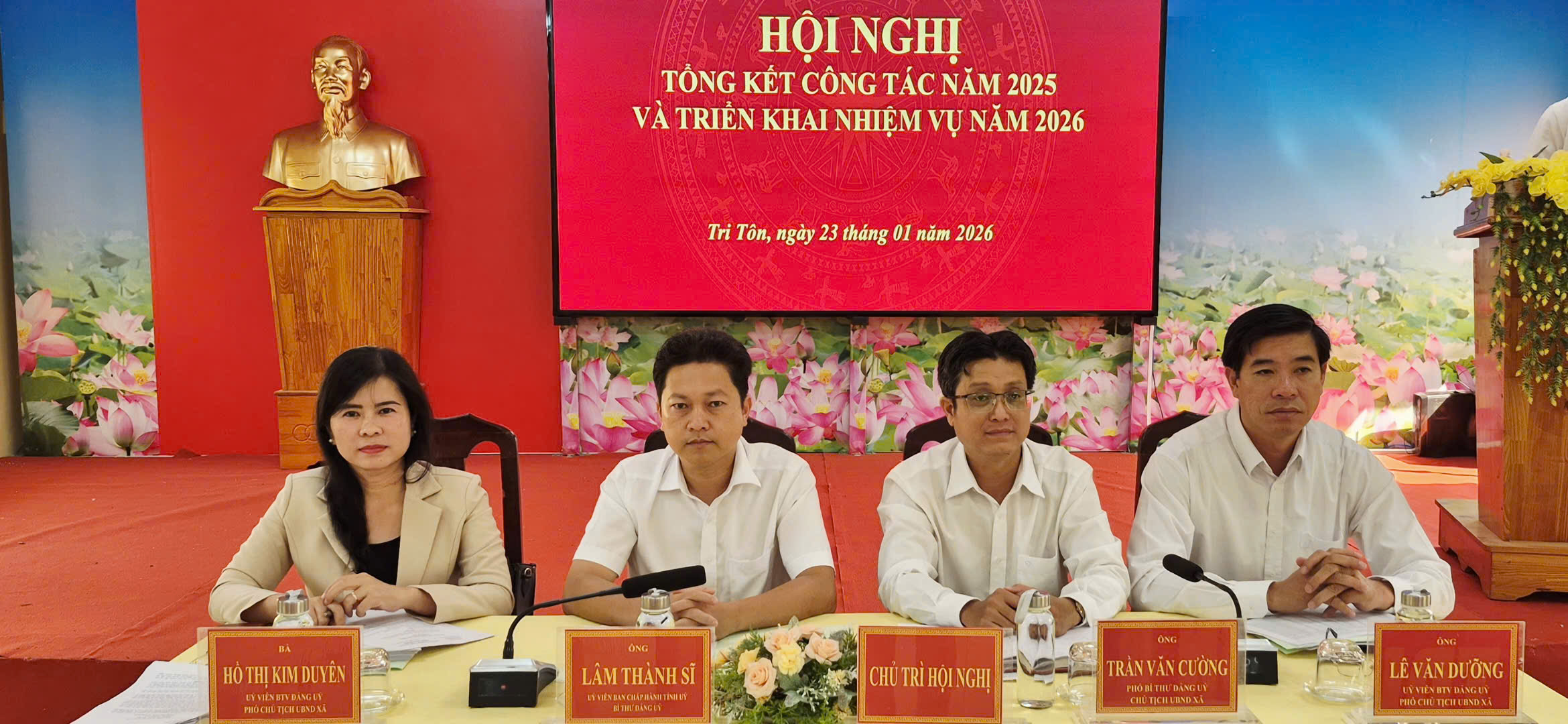 Chiều ngày 23/1/2026, UBND xã Tri Tôn tổ chức Hội nghị tổng kết công tác năm 2025, triển khai nhiệm vụ năm 2026. Tham dự có Đồng chí Lâm Thành Sĩ – TUV - Bí thư Đảng uỷ - Chủ tịch HĐND xã Tri Tôn; đồng chí Trần Văn Cường - Phó Bí thư Đảng uỷ - Chủ tịch UBND xã Tri Tôn chủ trì hội nghị. Cùng tham dự có 02 Phó Chủ tịch UBND xã Bà Hồ Thị Kim Duyên và ông Lê Văn Dưỡng.