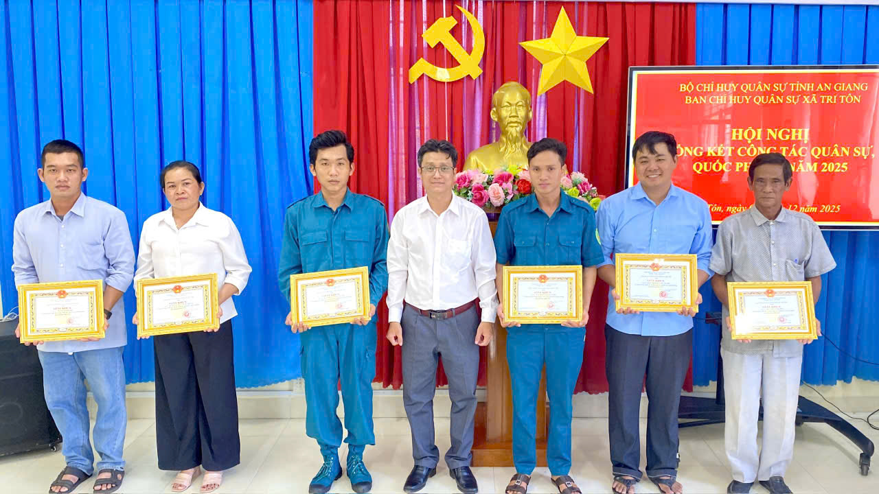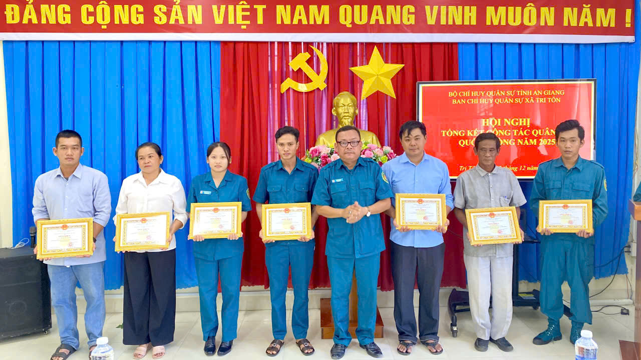 Dịp này, UBND xã Tri Tôn khen thưởng 07 tập thể và 21 cá nhân có thành tích xuất sắc trong thực hiện nhiệm vụ quân sự, quốc phòng địa phương năm 2025.