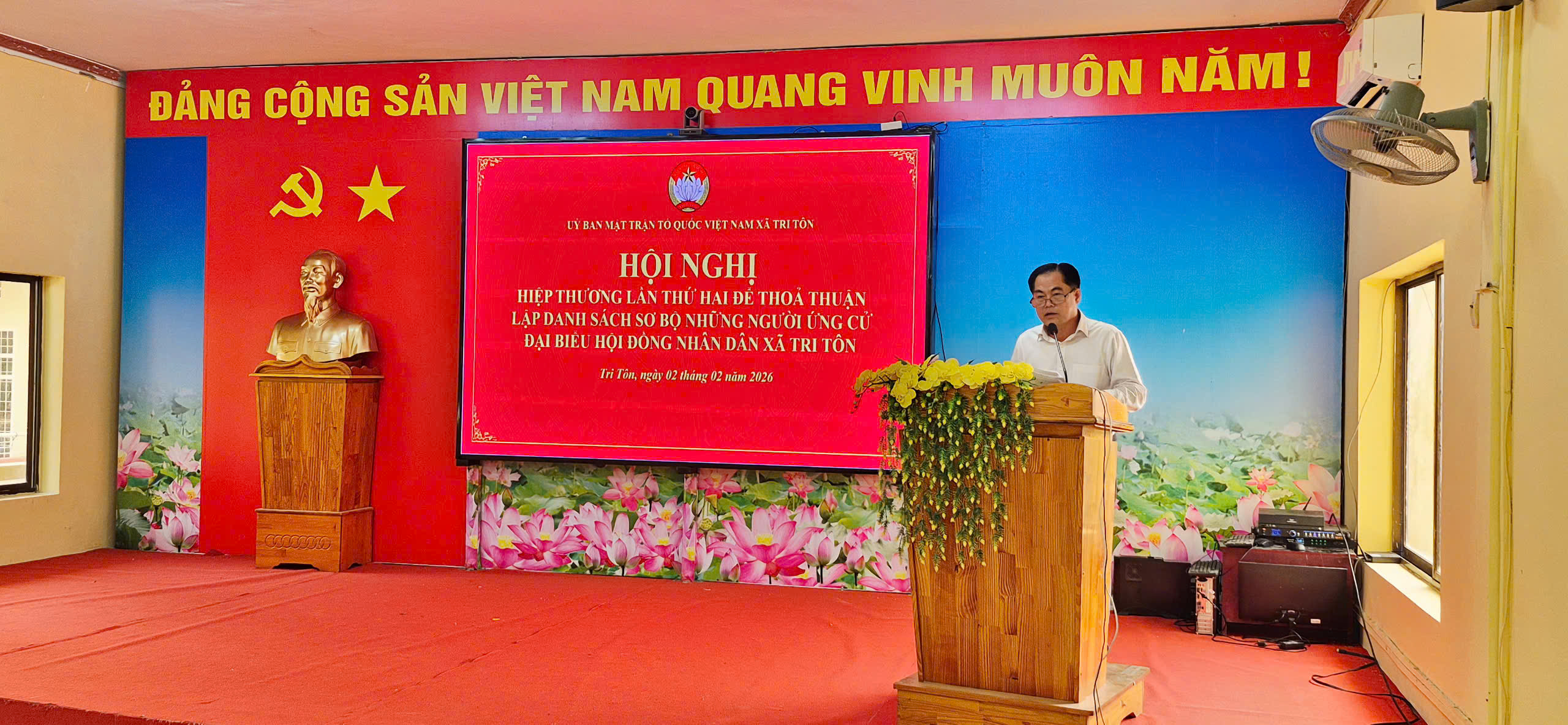 Thực hiện theo luật Bầu cử đại biểu Quốc hội và đại biểu HĐND, Sáng ngày 02/02/2026, Ủy ban Mặt trận Tổ quốc Việt Nam xã Tri Tôn tổ chức Hội nghị hiệp thương lần thứ hai nhằm thỏa thuận lập danh sách sơ bộ những người ứng cử đại biểu Hội đồng nhân dân xã Tri Tôn, nhiệm kỳ 2026 – 2031.