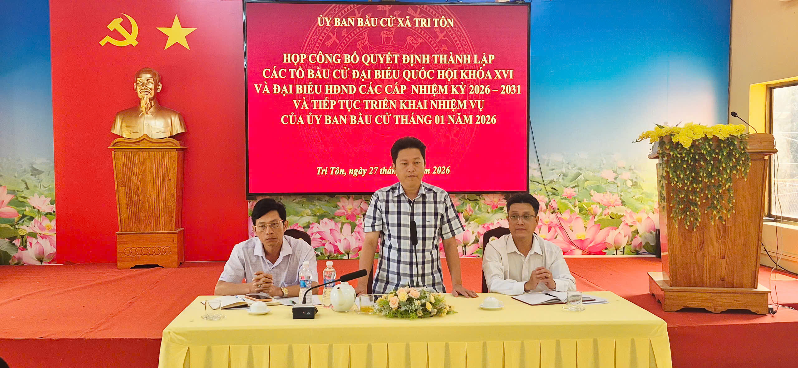 Sáng ngày 27/01/2026, Ủy ban bầu cử xã Tri Tôn tổ chức phiên họp công bố quyết định thành lập các Tổ bầu cử đại biểu Quốc hội khóa XVI và đại biểu Hội đồng nhân dân các cấp, nhiệm kỳ 2026 - 2031. Tham dự hội nghị có Ông Lâm Thành Sĩ – TUV – Bí thư Đảng ủy – Chủ tịch HĐND – Trưởng Ban chỉ đạo bầu cử xã Tri Tôn; ông Lộ Vinh Huy – Phó Bí thư Thường trực Đảng ủy – Phó Trưởng Ban chỉ đạo bầu cử xã; ông Trần Văn Cường – Phó Bí thư Đảng ủy – Chủ tịch UBND – Chủ tịch UBBC xã và các đồng chí thành viên Ban chỉ đạo, thành viên UBBC xã, Tổ trưởng các Tổ bầu cử và Trưởng các ấp trên địa bàn.