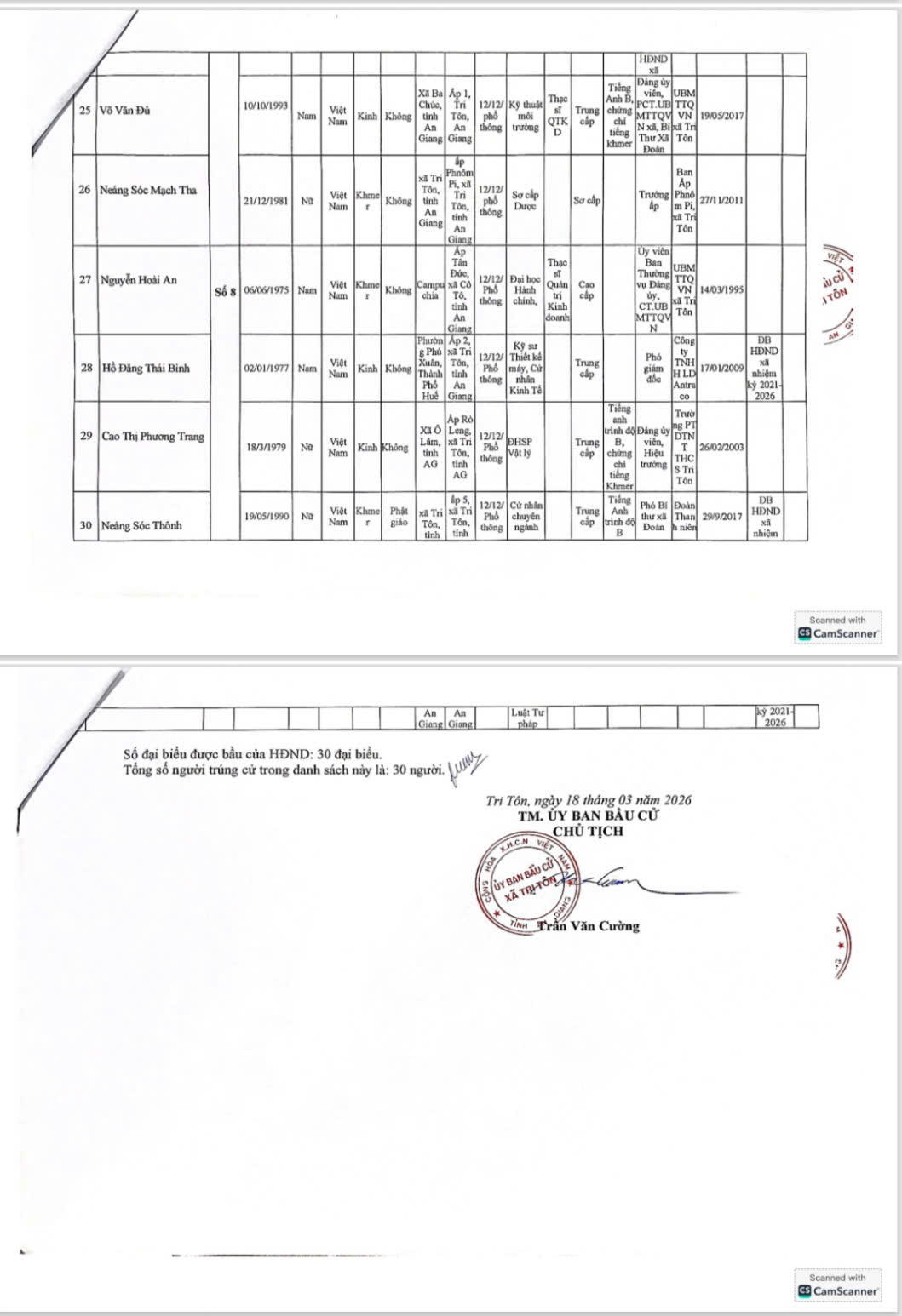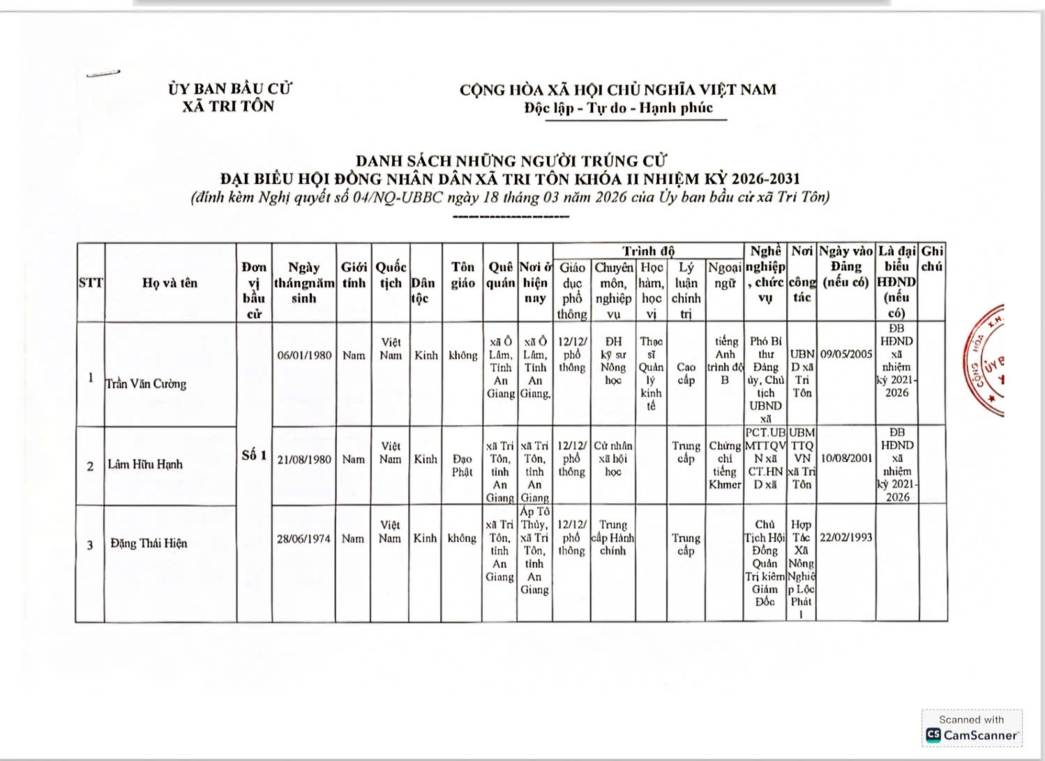 ỦY BAN BẦU CỬ XÃ TRI TÔN CÔNG BỐ KẾT QUẢ BẦU CỬ VÀ DANH SÁCH NHỮNG NGƯỜI TRÚNG CỬ ĐẠI BIỂU HỘI ĐỒNG NHÂN DÂN XÃ TRI TÔN KHÓA II, NHIỆM KỲ 2026 - 2031