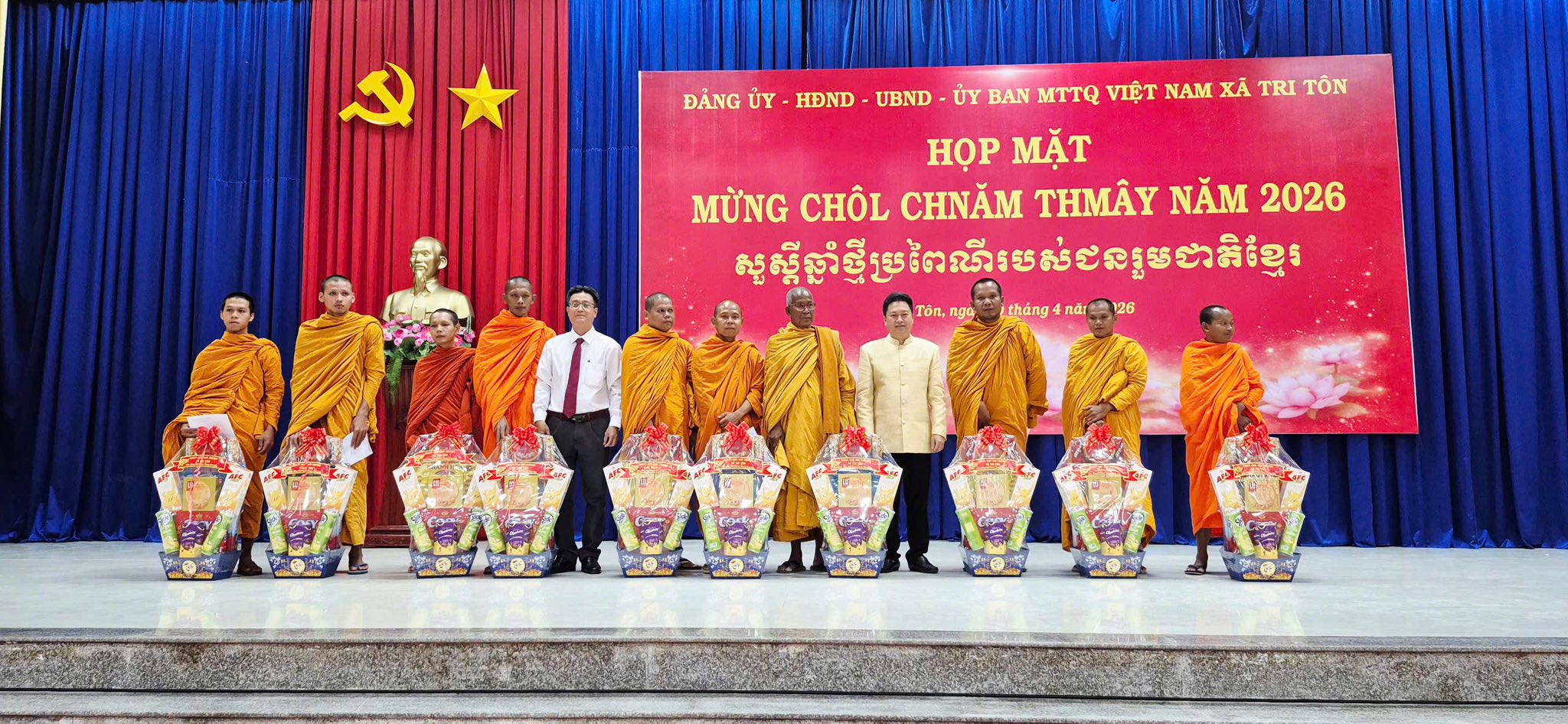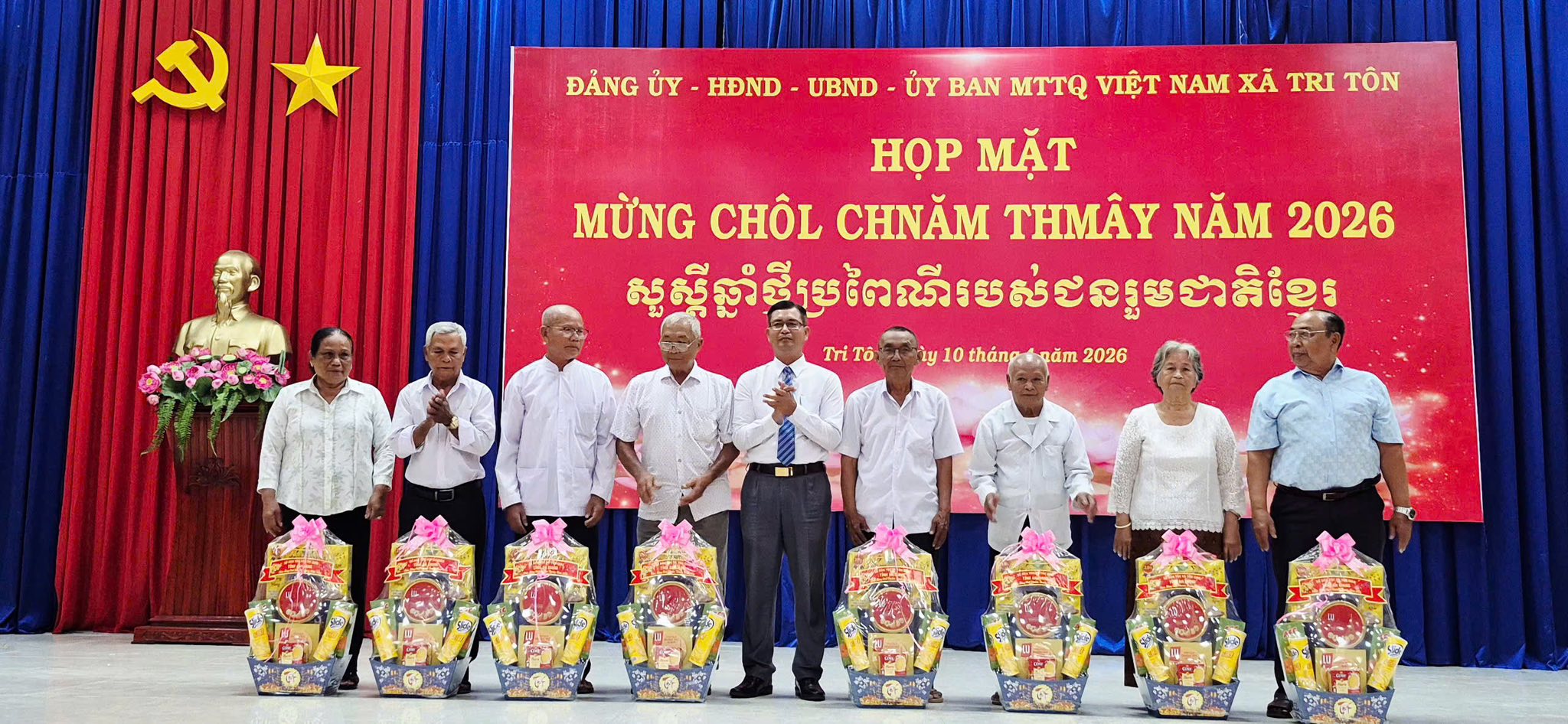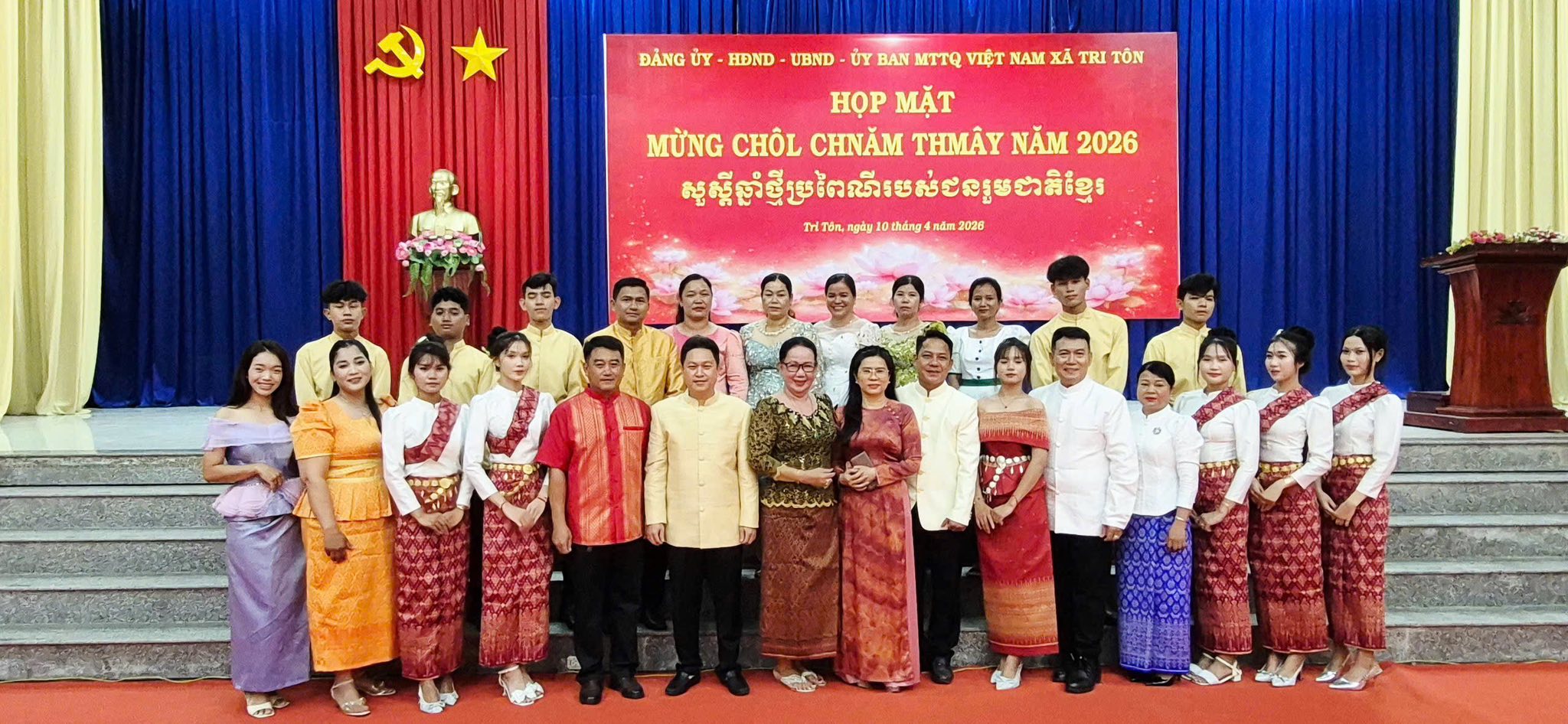 Chiều ngày 10/4/2026, Đảng ủy – HĐND – UBND – Ủy ban MTTQ Việt Nam xã Tri Tôn tổ chức họp mặt mừng Tết cổ truyền Chôl Chnăm Thmây năm 2026 của đồng bào dân tộc Khmer trên địa bàn xã. Đây là hoạt động thể hiện sự quan tâm sâu sắc của cấp ủy, chính quyền địa phương đối với đời sống văn hóa, tinh thần của đồng bào dân tộc Khmer.